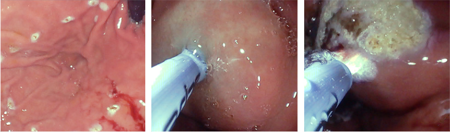 The area to be ablated is elevated with saline solution by means of high-pressure needle-free injection and then ablated with argon plasma coagulation (APC). These two steps are repeated until the entire area has been ablated.
