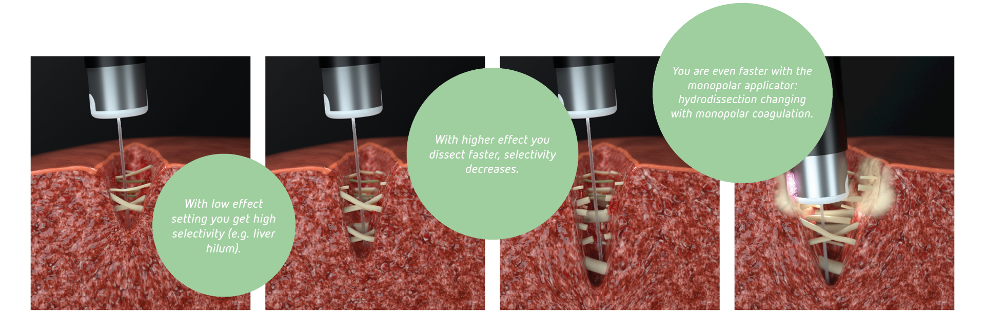 Dissection, coagulation and aspiration combined in one instrument. This shortens your operating time.